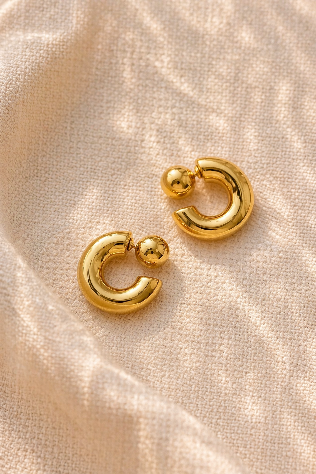Évoquant la délicatesse d'une œuvre d'art, les boucles d'oreilles Lili, en acier inoxydable doré, présentent un élégant jeu de formes avec une sphère d'un côté et un cercle de l'autre, offrant ainsi une versatilité raffinée. Que vous choisissiez l'une ou l'autre, chaque port révèle un éclat subtil et une sophistication inégalée, invitant à la contemplation.