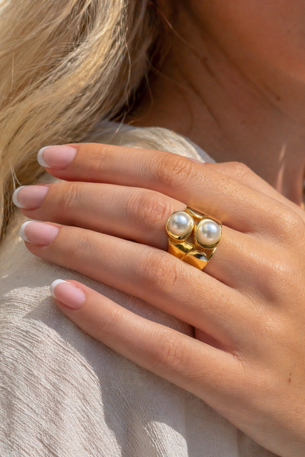 La bague Bella, en acier inoxydable doré, est une ode à la délicatesse. Deux perles naturelles blanches, telles des gouttes de rosée au matin, évoquent l’élégance intemporelle. Un bijou qui sublime la main avec une touche de sophistication discrète, alliant modernité et tradition dans un parfait équilibre.